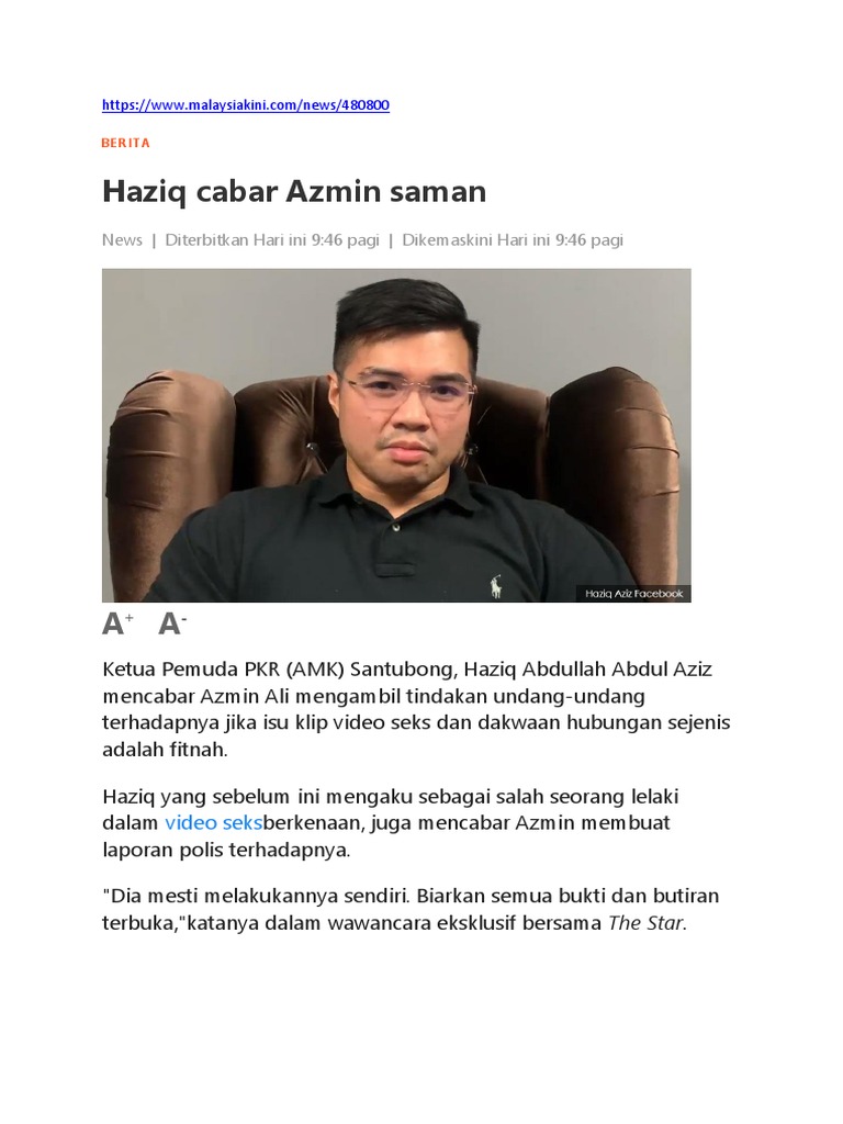 Langkawi • mr haziq aziz has dared datuk seri azmin ali to take legal action against him if the malaysian economic affairs minister is confident of his own innocence. Haziq named azmin as the other person in the video, a claim the pkr deputy. Santubong pkr division youth chief haziq abdullah abdul aziz has reiterated his claim of indulging in sexual acts with economic affairs minister azmin ali. Haziq abdullah abdul aziz confessed that he was one of the two men in the video. A copy of haziq's flight ticket showed that he flew to sandakan on.