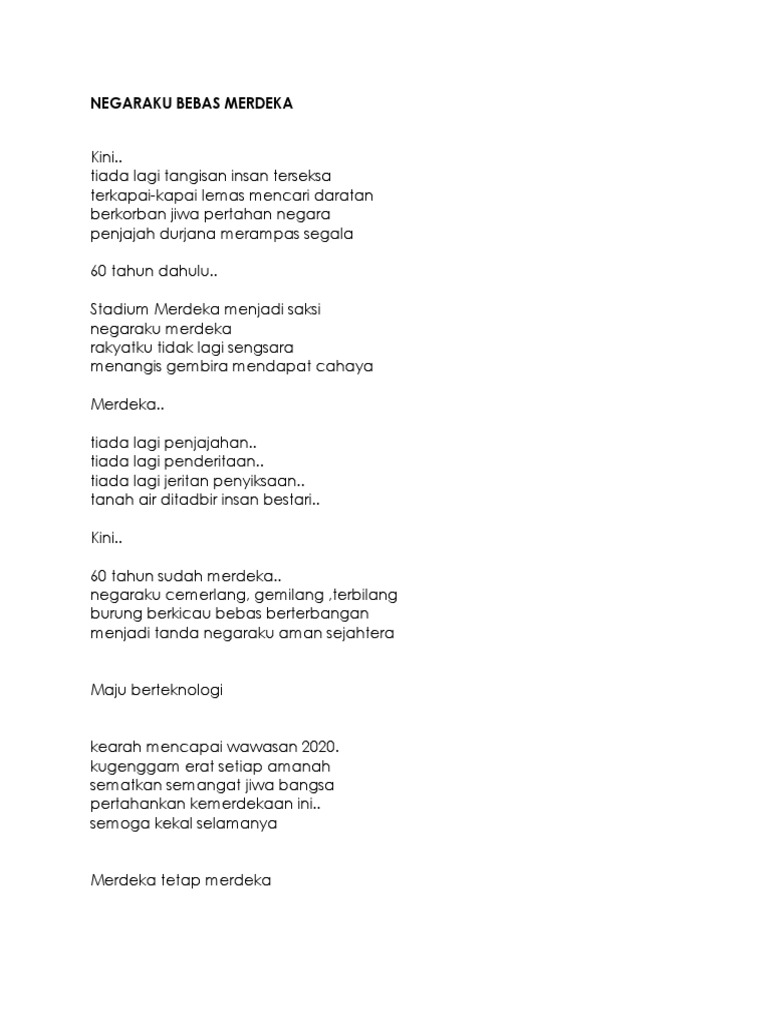 September 10 at 1:55 am ·. نݢاراکو) dipilih daripada lagu rasmi negeri perak yang berasal daripada pulau mahé di kepulauan seychelles, telah dibawa pulang oleh sultan abdullah setelah baginda selesai menjalani hukuman dibuang negeri ke kepulauan seychelles. Disebut bebas karena sajak tidak terikat oleh aturan seperti pada jumlah baitnya, jumlah suku katanya, dan persamaan suara pada ujung di setiap barisnya. Lagu yang dirilis pada 2005 ini disejajarkan dengan lagu top mereka, welcome to my paradise. Am bebas lepas tanpa beban dm g c am dm g aku merdeka. Stadium merdeka menjadi saksi negaraku merdeka rakyatku tidak lagi sengsara menangis gembira. Sajak atau bentuk puisi dalam bahasa sunda ini juga sering di sebut dengan sajak bebas. Tanah air ditadbir insan bijak bestari. Negaraku cemerlamg,gemilang dan terbilang burung berkicauan bebas berterbangan menjadi tanda negaraku aman damai. Am bebas lepas tanpa beban dm g c aku merdeka. Sajak ini dideklamasikan oleh adik muhammad aidil amsyar bin zulkifli dari sk buntong, ipoh. Cikgu fisya sebayu 2.364 views1 year ago. Gemamd bebas lepas tanpa beban aku merdeka.